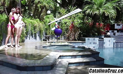 Bodacious cougars in bathing suit fondle and fuck each other by the poolside